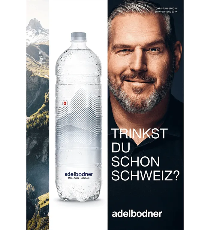 Les nouveaux copropriétaires de la seule source d’eau minérale du canton de Berne sont Christian Stucki, Mark Streit, Roman Josi, Yann Sommer et le coach de tennis Severin Lüthi. Avec la question provocatrice «Trinkst du schon Schweiz?» (Bois-tu de l’eau suisse?), la publicité souligne le fait que près de la moitié de l’eau minérale consommée en Suisse est importée. Un phénomène auquel la marque veut remédier. La bouteille est ornée d’une croix suisse et du chiffre 1559, qui se réfère à la première utilisation mentionnée comme source minérale. Il est également indiqué qu’Adelbodner est numéro 1 des eaux minérales suisses en termes de teneur en calcium. Adelbodner est conditionnée en bouteilles à boissons en PET recyclé.