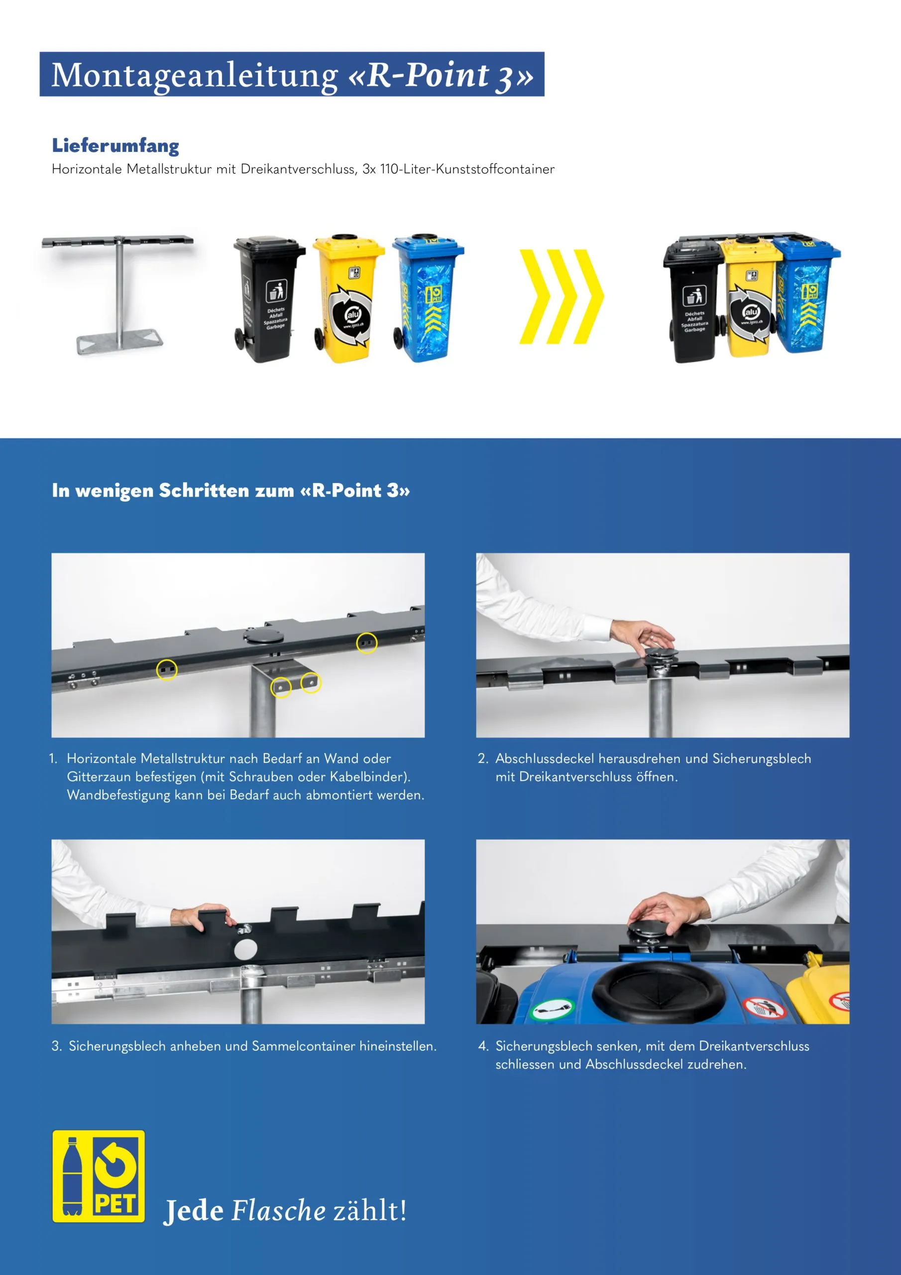 1x Alu, 1x Abfall), je 10 PET- und Alu-Sammelsäcke. Die Recyclingstation wird auf 2 Paletten geliefert.